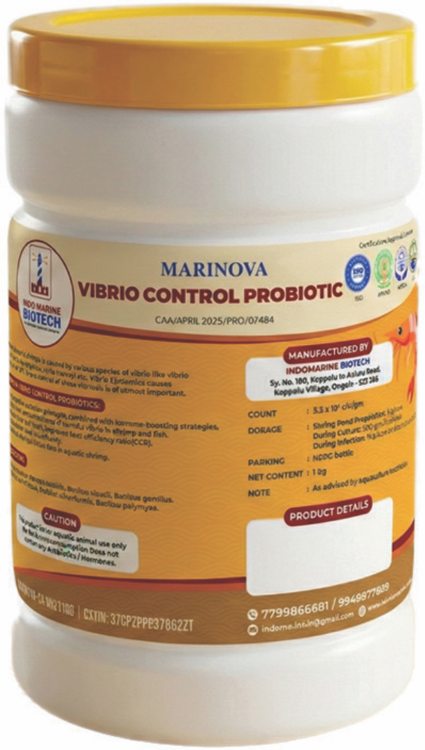 Unlike viruses, bacterial diseases of shrimp are mostly caused by various species of vibrio like vibrio cholera, vibrio alginolyticus, vibrio harveyi etc. These pathogens have led to the collapse of many farms due to its severe effect on hatcheries and culture ponds. Vibrio Epidemics causes mortality over 90%. Hence control of these vibrios is of utmost important, Marinova vibrio control probiotics giving promising results in protecting aquatic animals from vibriosis based on principle of competitive exclusion and immune stimulation for improving defense mechanism against pathogenic vibrio bacteria. It reduces the vibrio loads significantly and it also improves FCR and immunity of shrimp/fish.